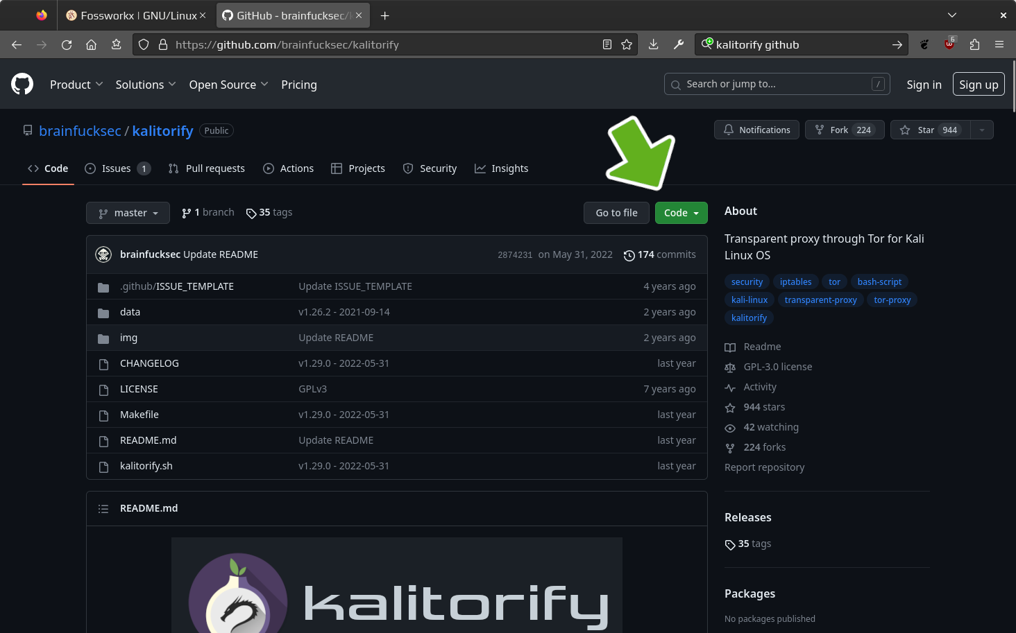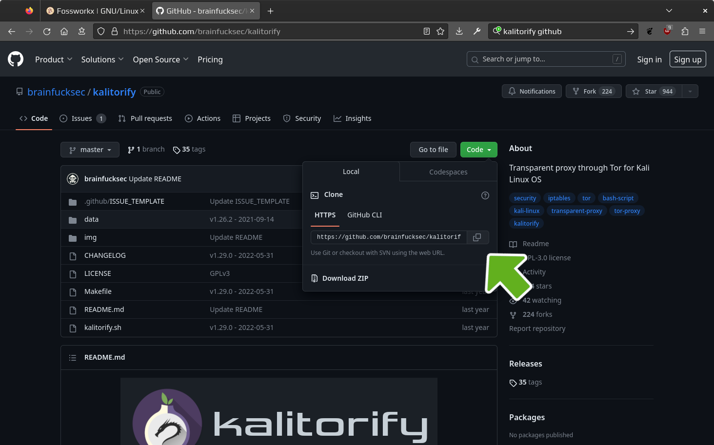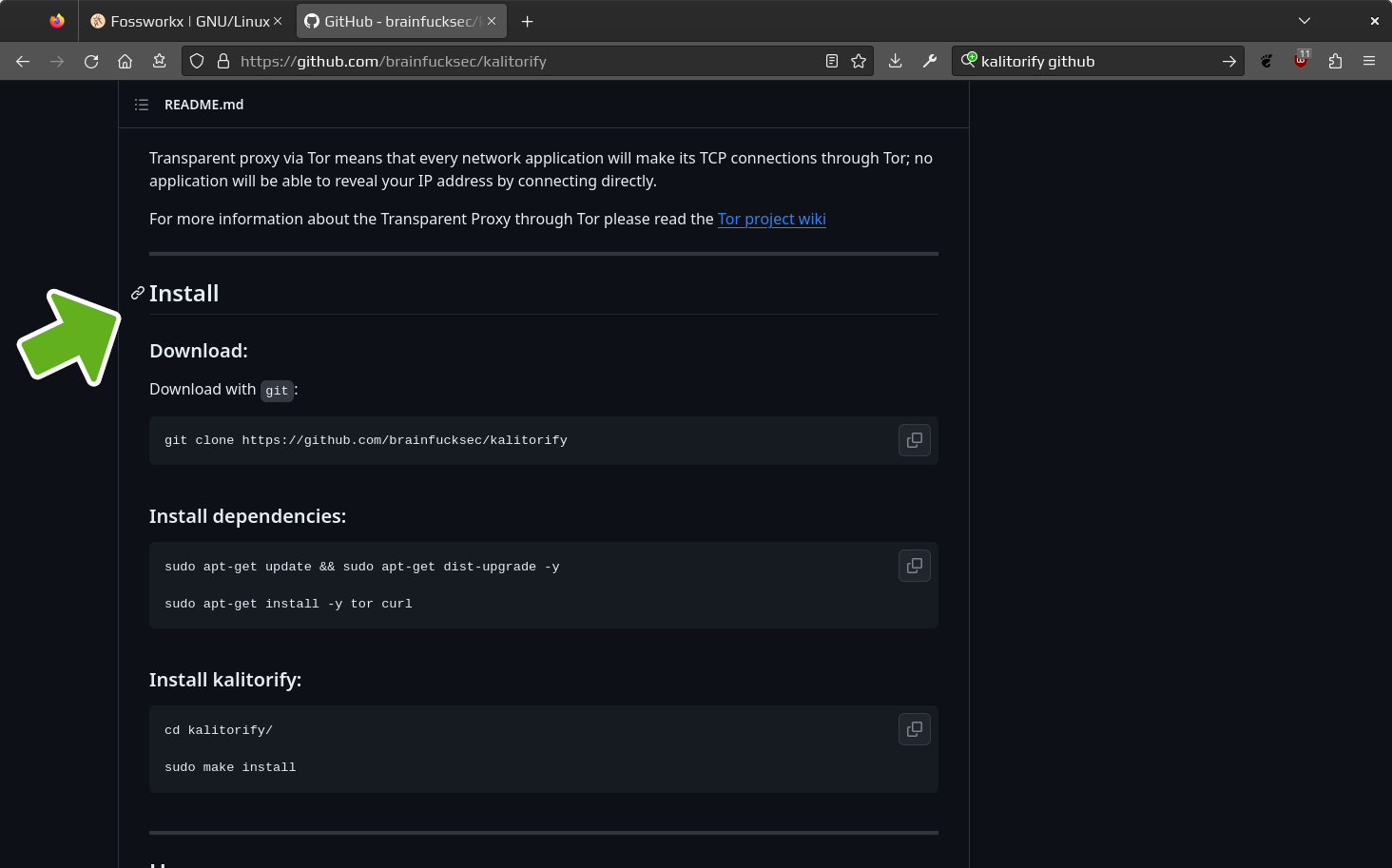 Clone the repository. This will download the contents of the link copied from the github website to the system. In this example kalitorify will be used. Type git clone followed by a space, then paste in the link that was just copied from the Github website.