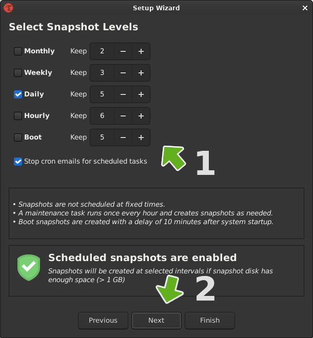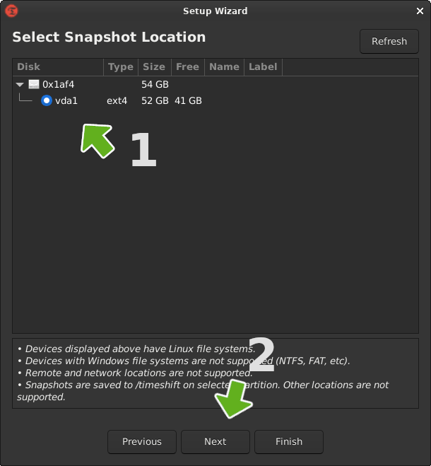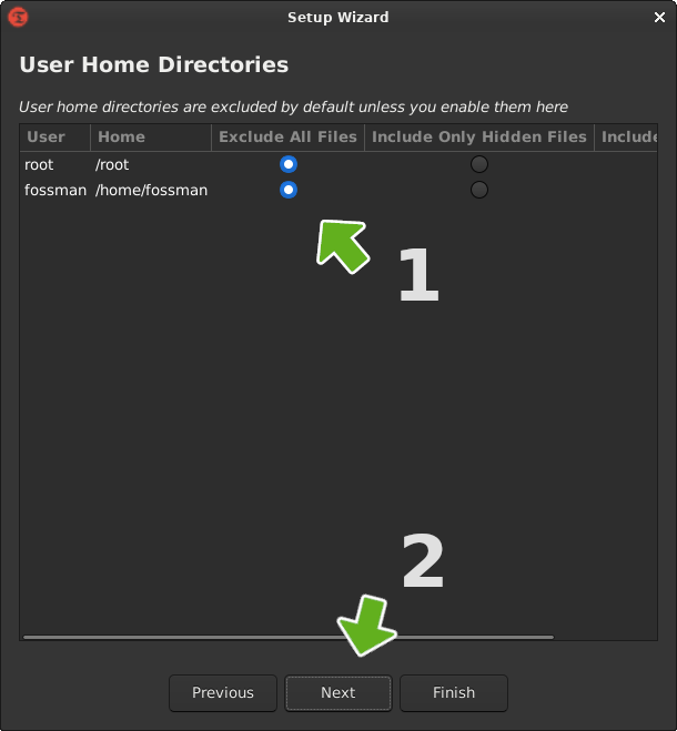 By default, your root and home directories will be excluded. This will ensure only the resources required to get the system up and running will be included in the snapshot. This is a great option if you normally back up your files to a separate drive as they do not need to be included in the snapshot. But if you would like to include them, select the include option. Then click [Next]