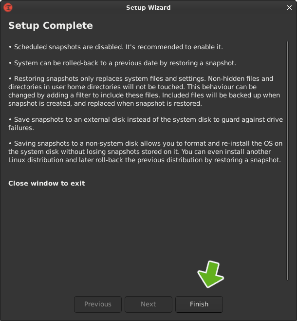 Now that the system is configured and all packages have been installed, taking a snapshot of the system would ensure you can easily return the system to it's present state if disaster may happen to strike in the future. To accomplish this, a tool called Timeshift can be used. In most cases will be installed on the system by default, but if you were unable to find it, the following commands can be use to install it.