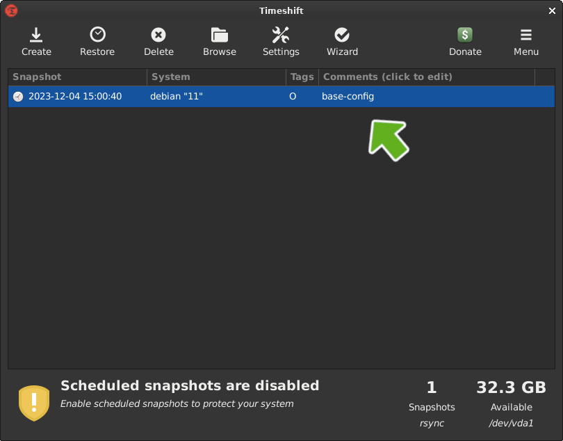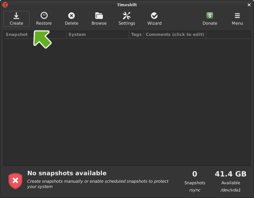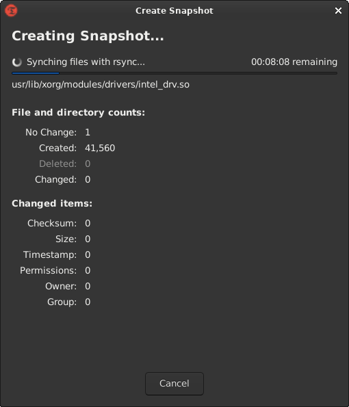 Now with all of the heavy lifting out of the way, all that needs to be done, is to click on [Create]. The snapshot will take from 5 to 10 minutes depending on the system and take up at least 10GB of disk space. The following snapshots will be much smaller in size and complete much faster, as it will only have to add what has been changed since the previous snapshot.