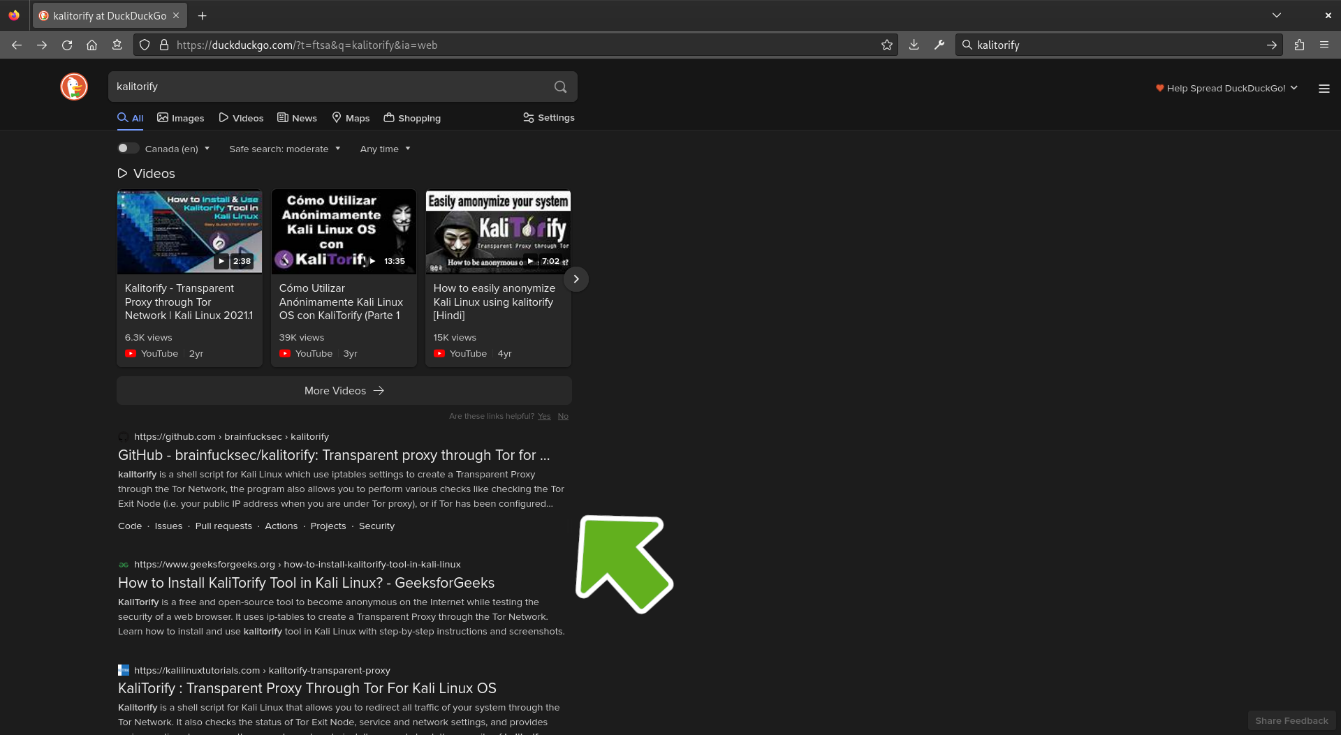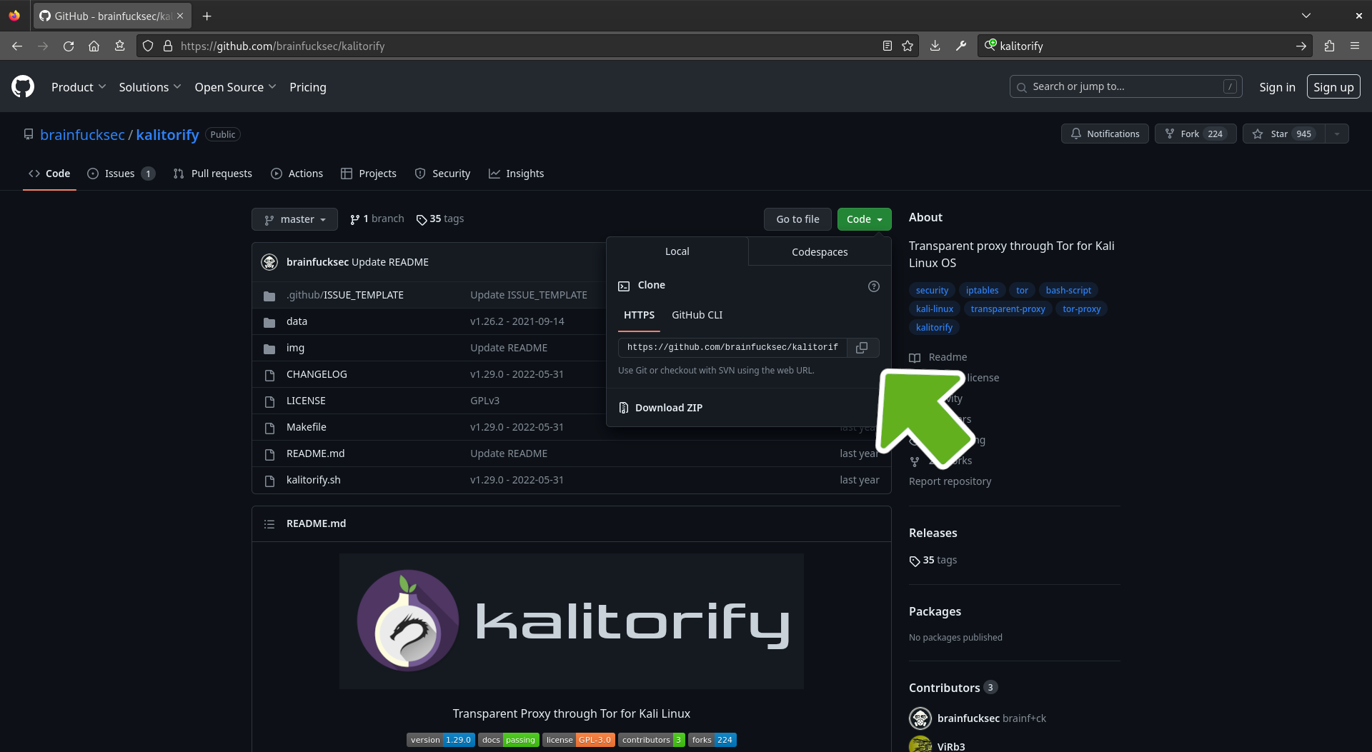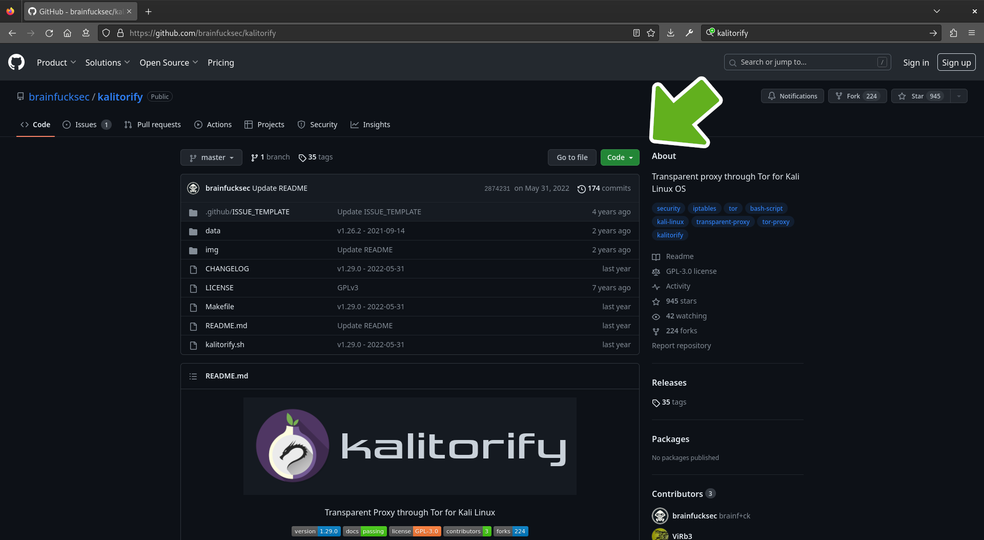 Open your browser and search for kalitorify followed by the word github. Then, click on the github link. Or use the following link to open it in a new tab. https://github.com/brainfucksec/kalitorify