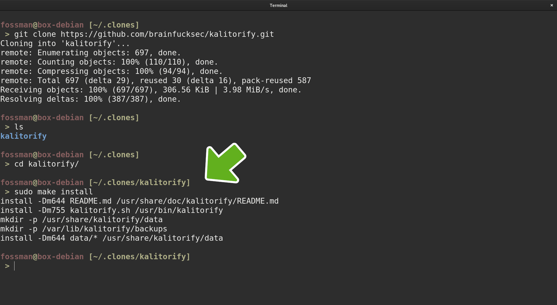 cd into the cloned kalitorify directory and run the make install command.