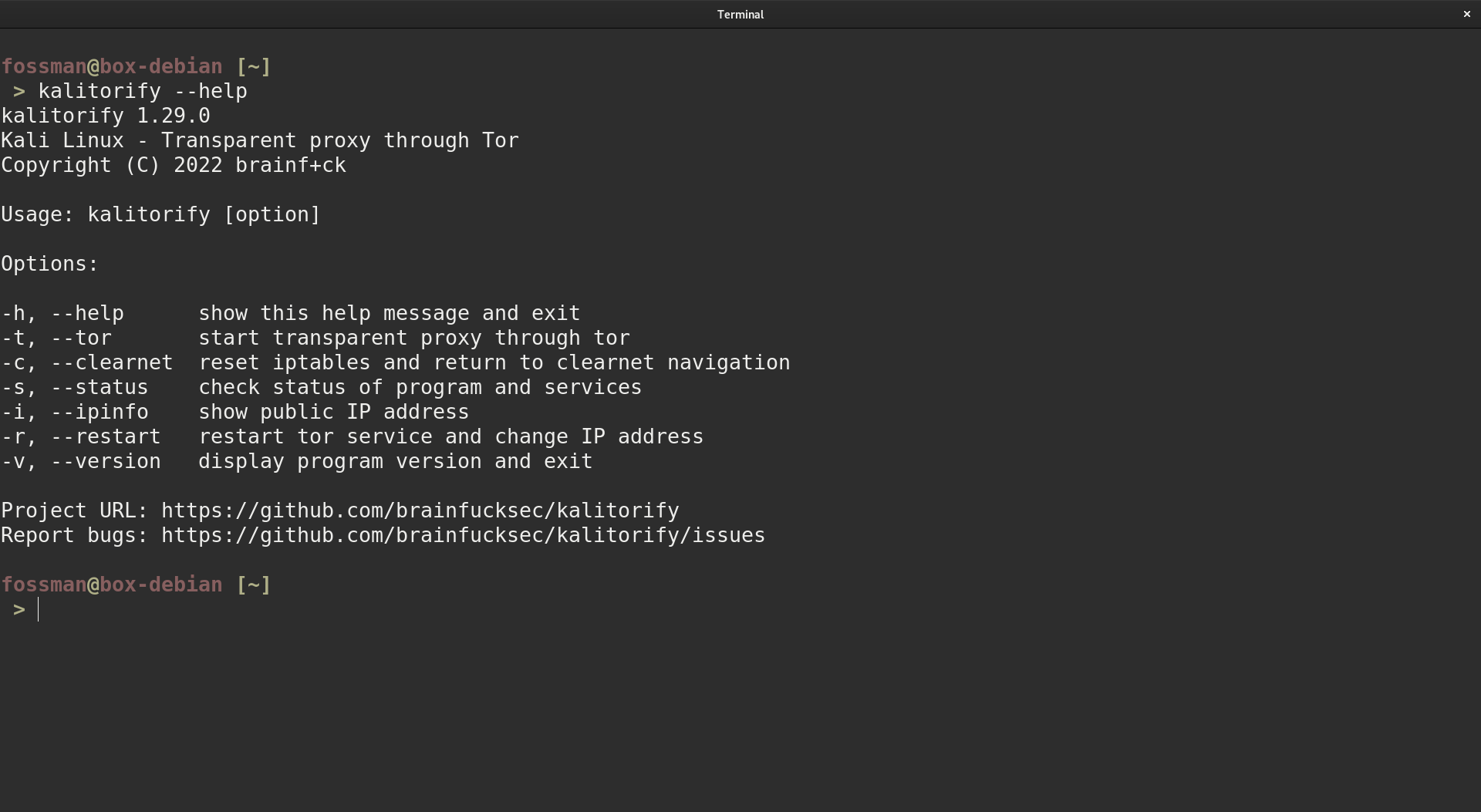 Similar to Proxychains, Kalitorify provides anonymity by routing your traffic through various Tor nodes before it reaches it's destination. But unlike Proxychains, Kalitorify covers the entire system. The following tools can be used to provide anonymity across the entire system using the Tor network. This would include the browser and all other applications connecting to the internet.