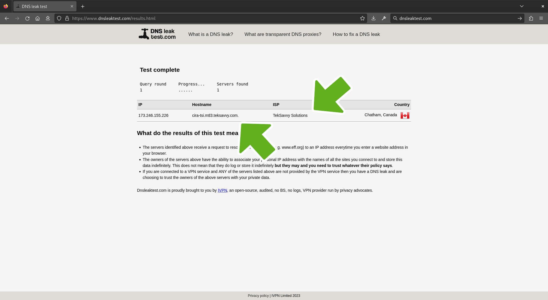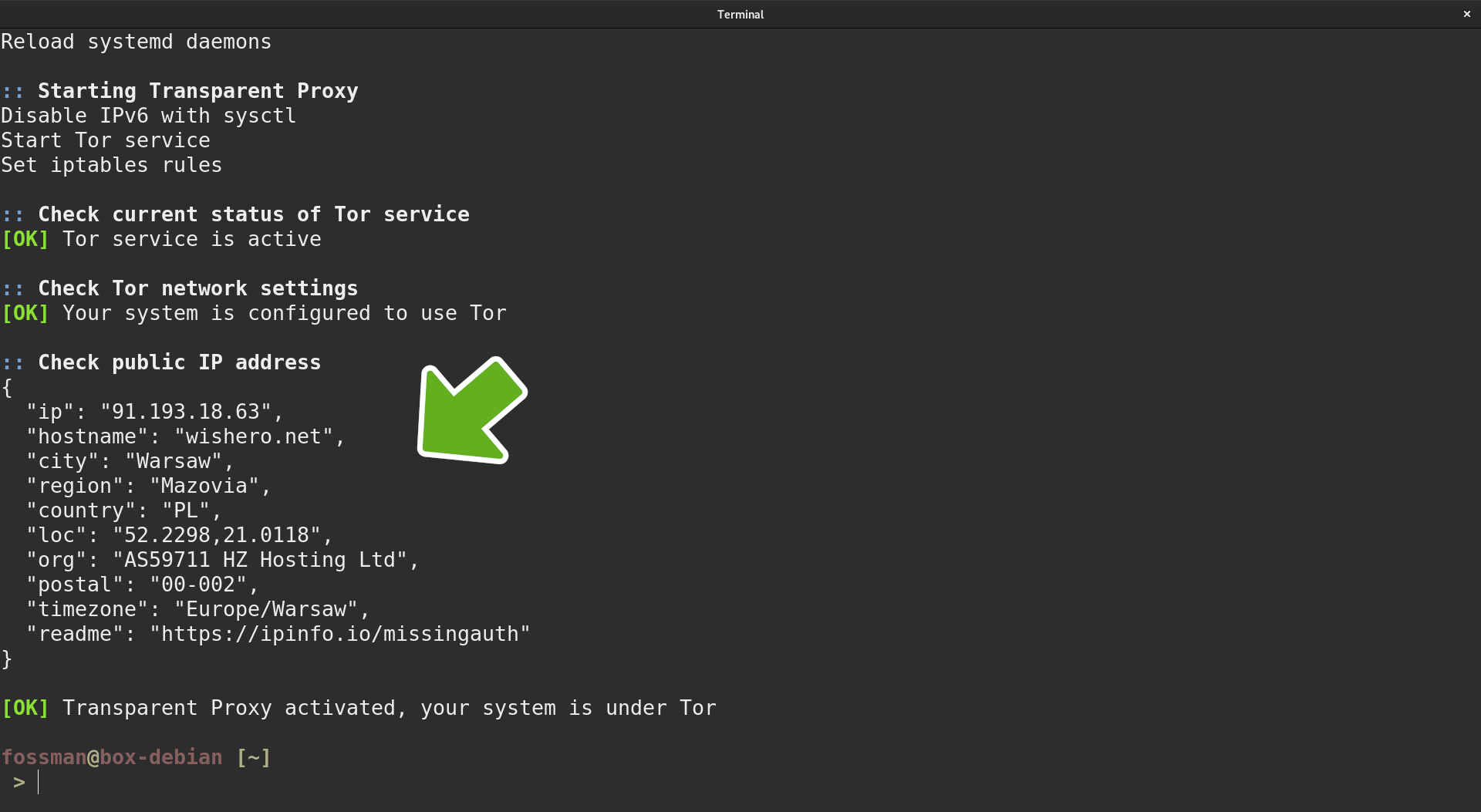 Open up a browser and navigate to https://www.dnsleaktest.com/ to confirm. Verify the IP address and country of origin have changed. If they do not match the ones shown in the terminal output, not to worry. As the location of the last hop may have change since it was originally designated by the application. Which is completely normal behavior. As long as it's not YOUR IP address information showing on the other end.