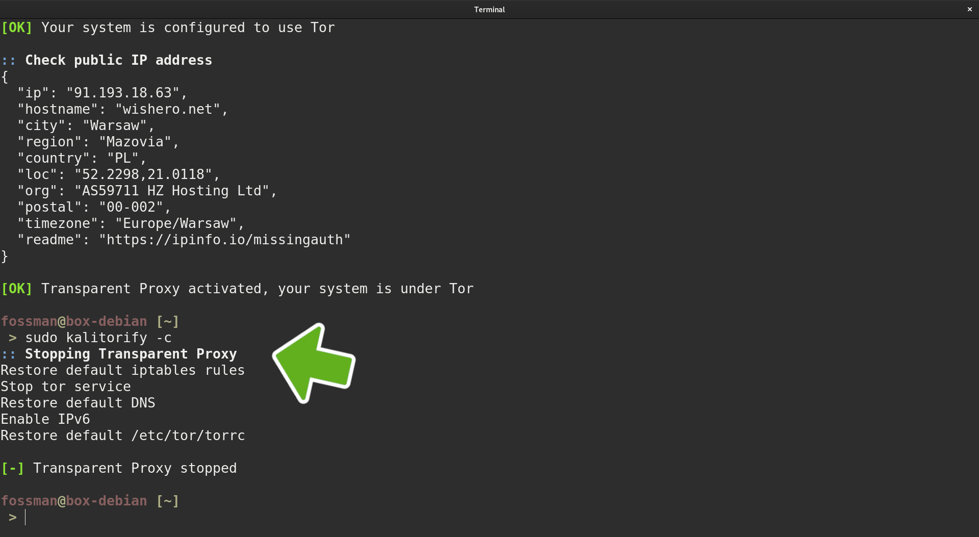 To close the Tor connection and go back to the clearnet, use the following command.