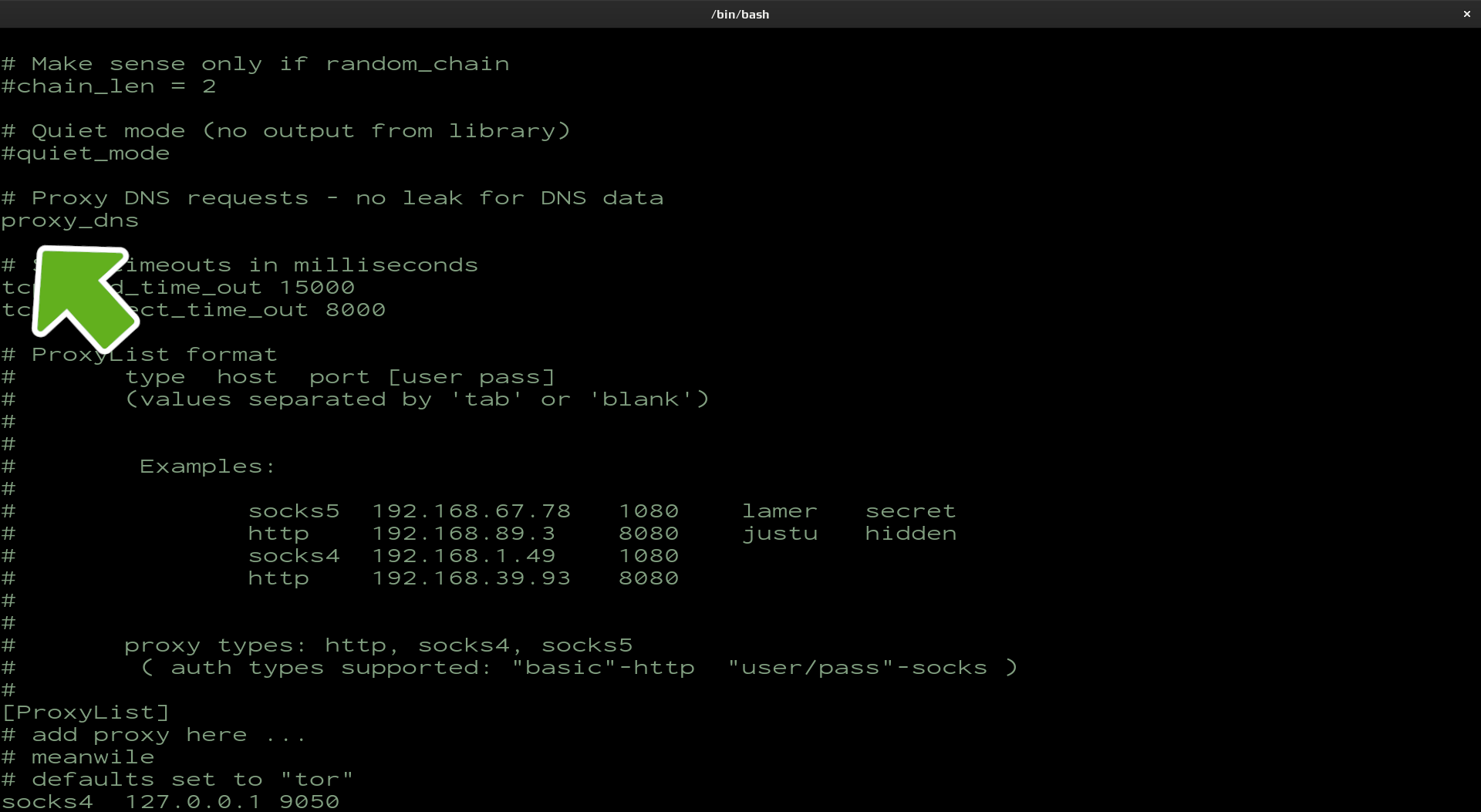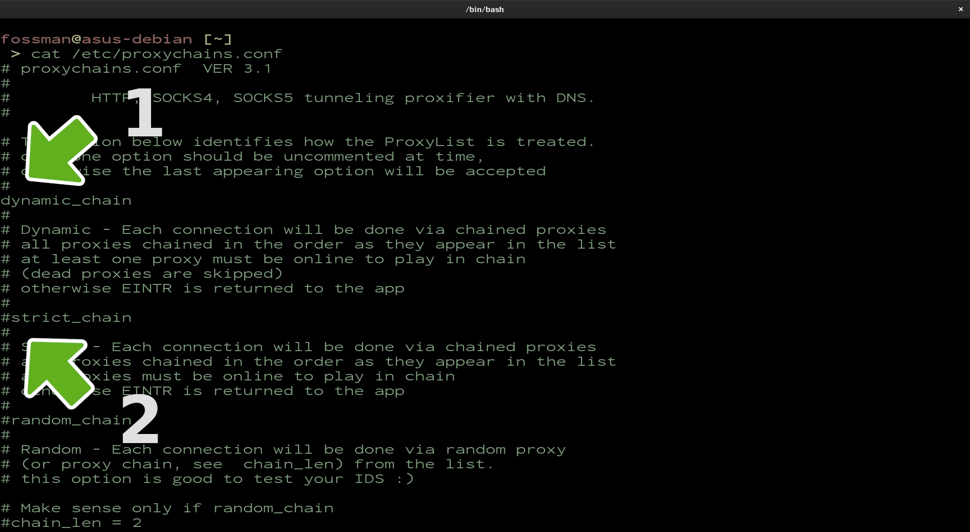 Determine how the proxy list is treated. strict_chain will usually be the default. This option will only allow connections through if all proxies in the list are active. dynamic_chain on the other hand uses a provided proxy list and cycles through proxies and skips the ones that are not working and the random_chain randomly chooses a proxy from the list below. In this example it is suggested to go with dynamic_chain