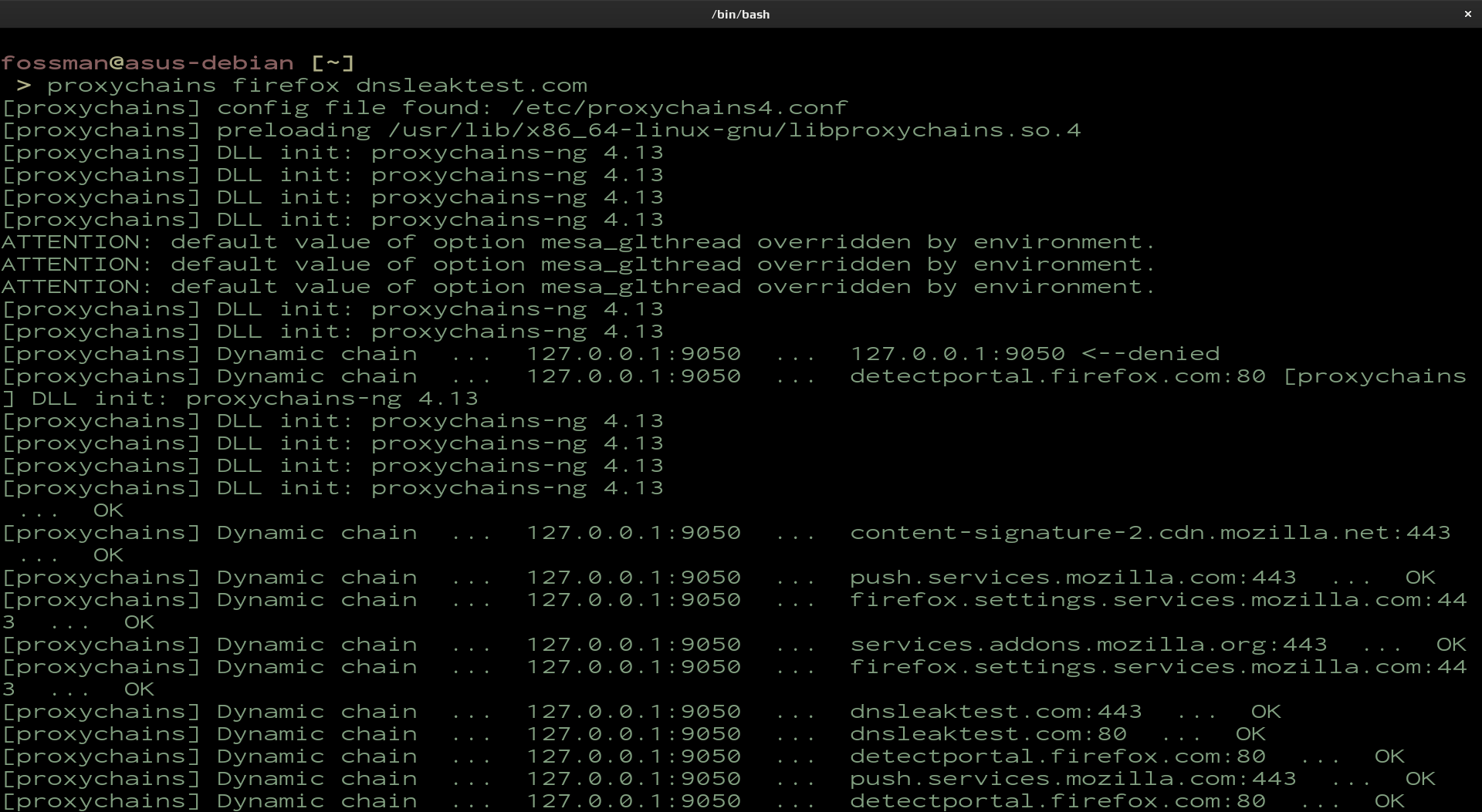 Use the following command to run the application. In this example Proxychains will be used to open dnsleaktest.com in the browser. Here we can ensure the public IP address has changed and that there are no dns leaks. Make sure the application you are opening with proxychains isn't already open.