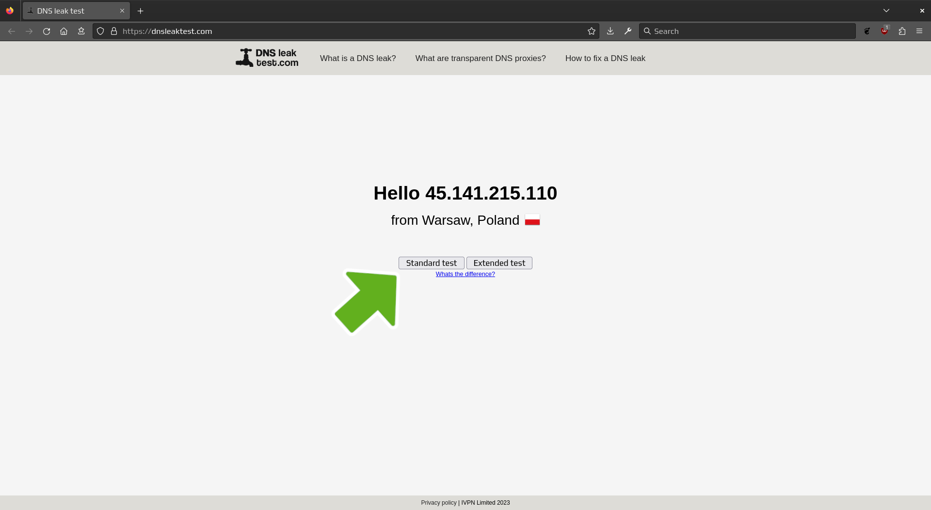 Next, click on Standard test to verify there was no DNS leak.