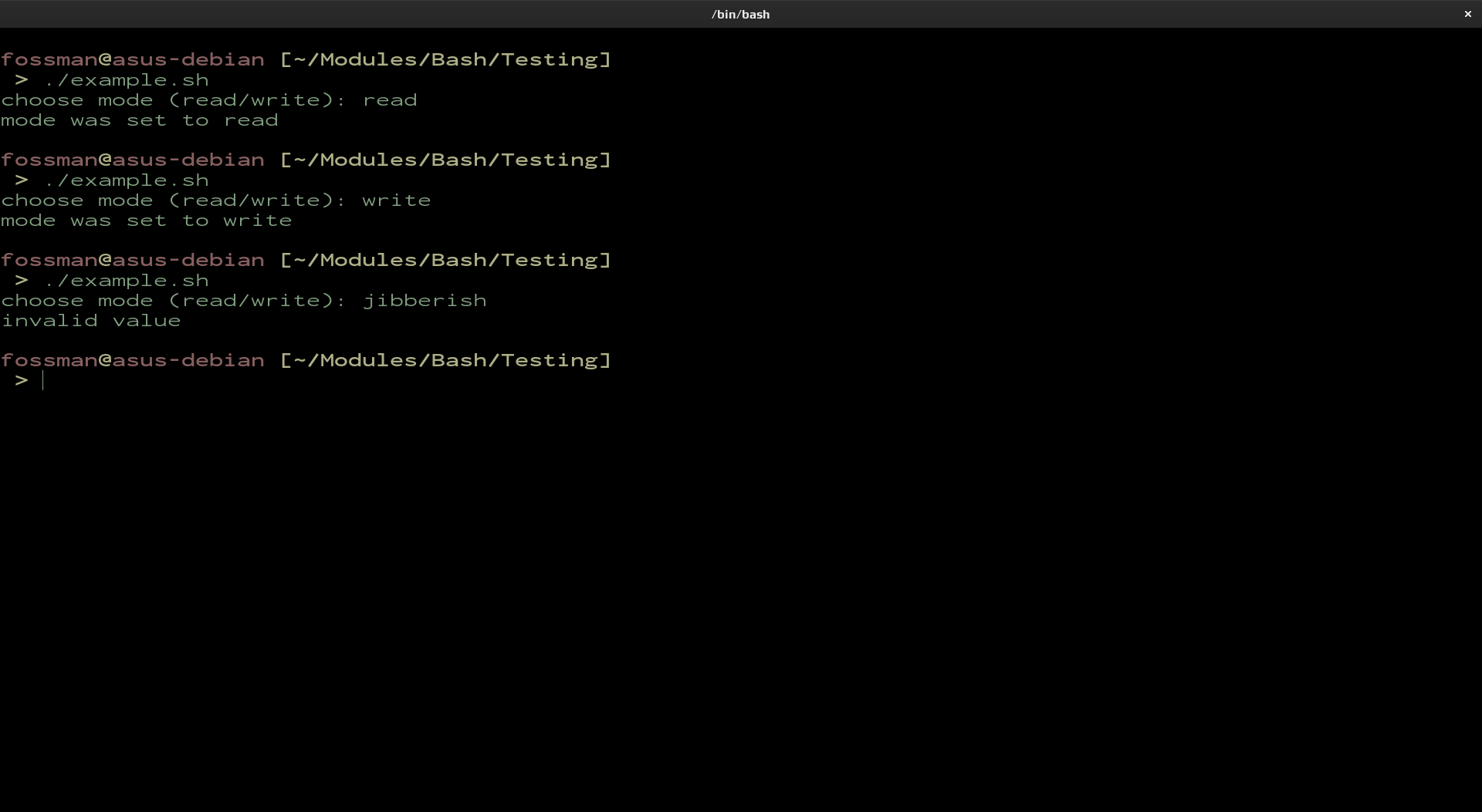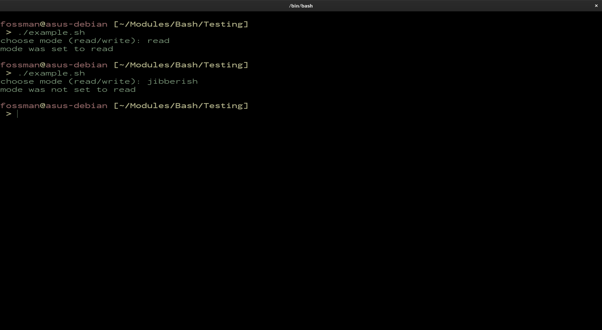 The following is an example scipt using a if/else statement. The user will first be asked to select a mode. If read is selected the message "mode was set to read" will be shown. If any other value is entered, the message "mode was not set to read" will be shown.