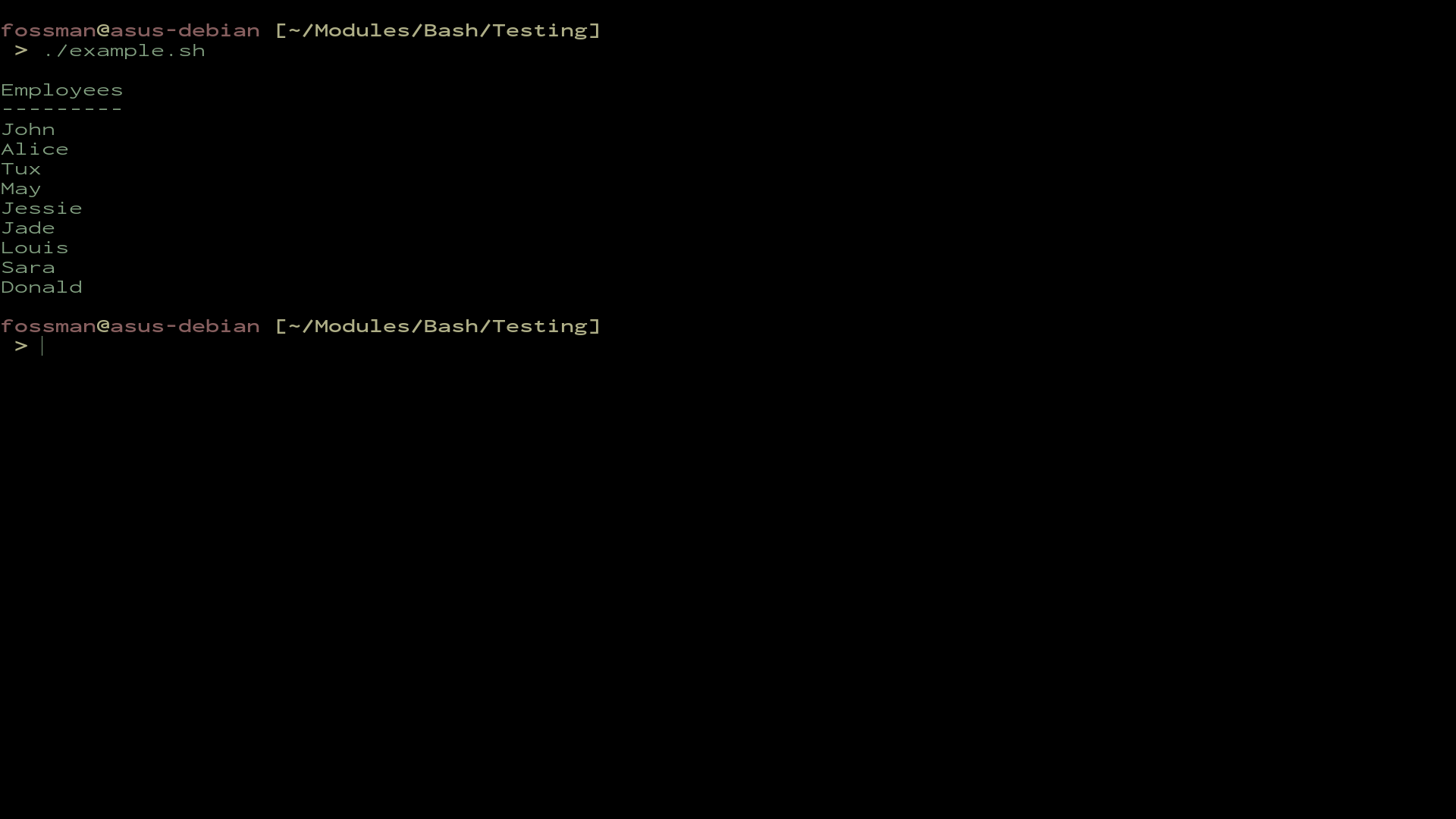 Employees=("John" "Alice" "Tux" "May" "Jessie" "Jade" "Louis" "Sara" "Donald")