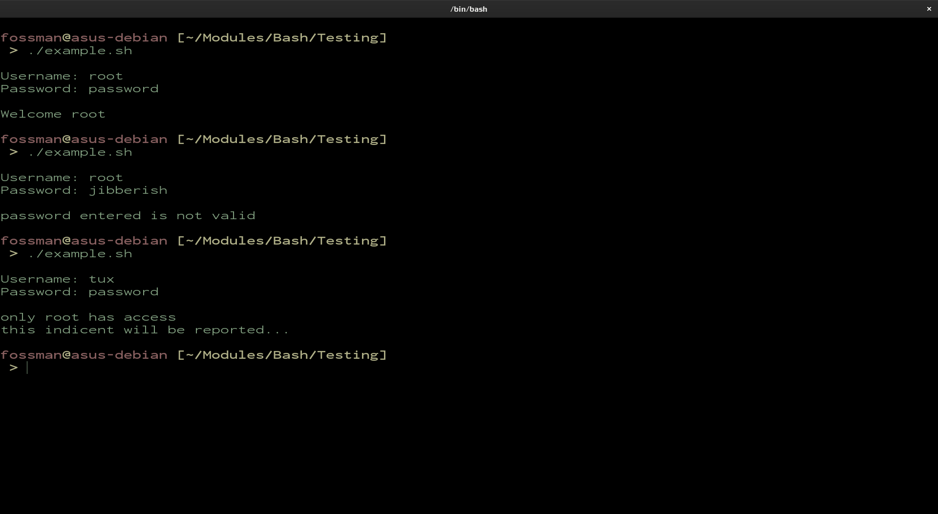 The following is an example scipt using a if/and statement. The user will first be asked to provide a username and password. If the username is root and the password is password, they will be presented with a welcome message. If the username entered is root and the password is not password, they will get a message saying the password is invalid. Finally... if the user is not root, they will be denied access and threatened.