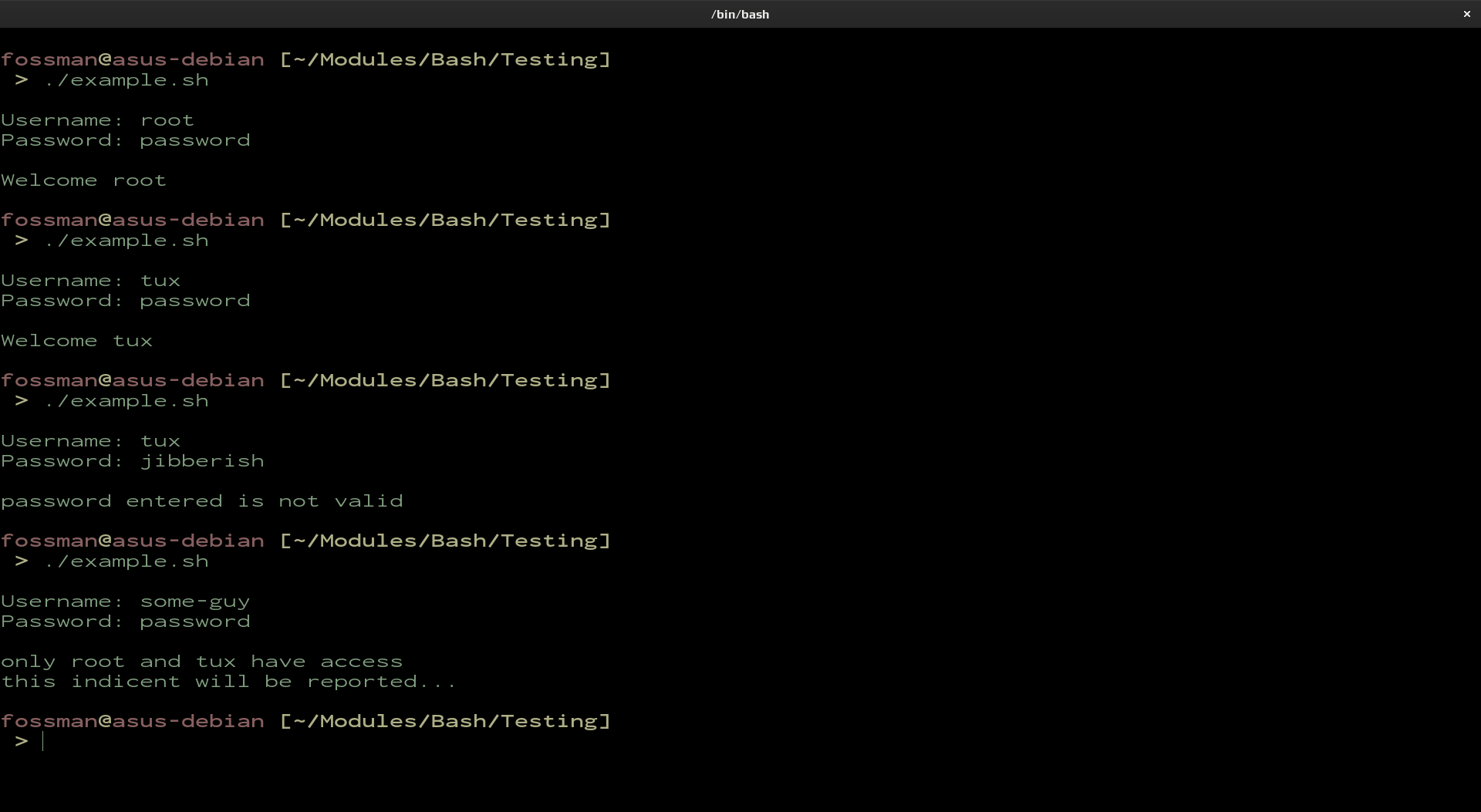 The following is an example scipt using a if/or statement. The user will first be asked to provide a username and password. If the username is root or tux and the password is password, they will be presented with a welcome message. If the username entered is root or tux and the password is not password, they will get a message saying the password is invalid. Finally... if the user is not root or tux, they will be denied access and threatened.