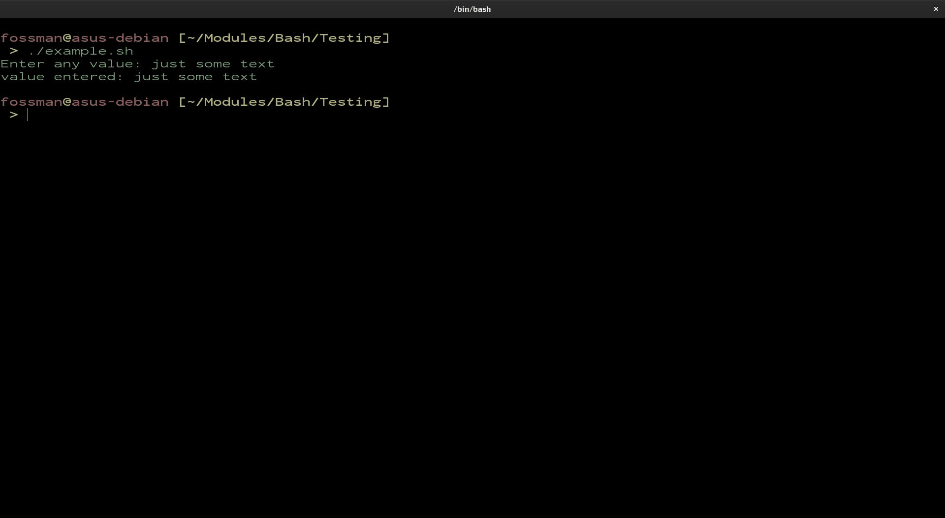#!/usr/bin/bash # user input echo -n "Enter any value: " read any_value # print out entered value echo "value entered: $any_value" # exit this script exit