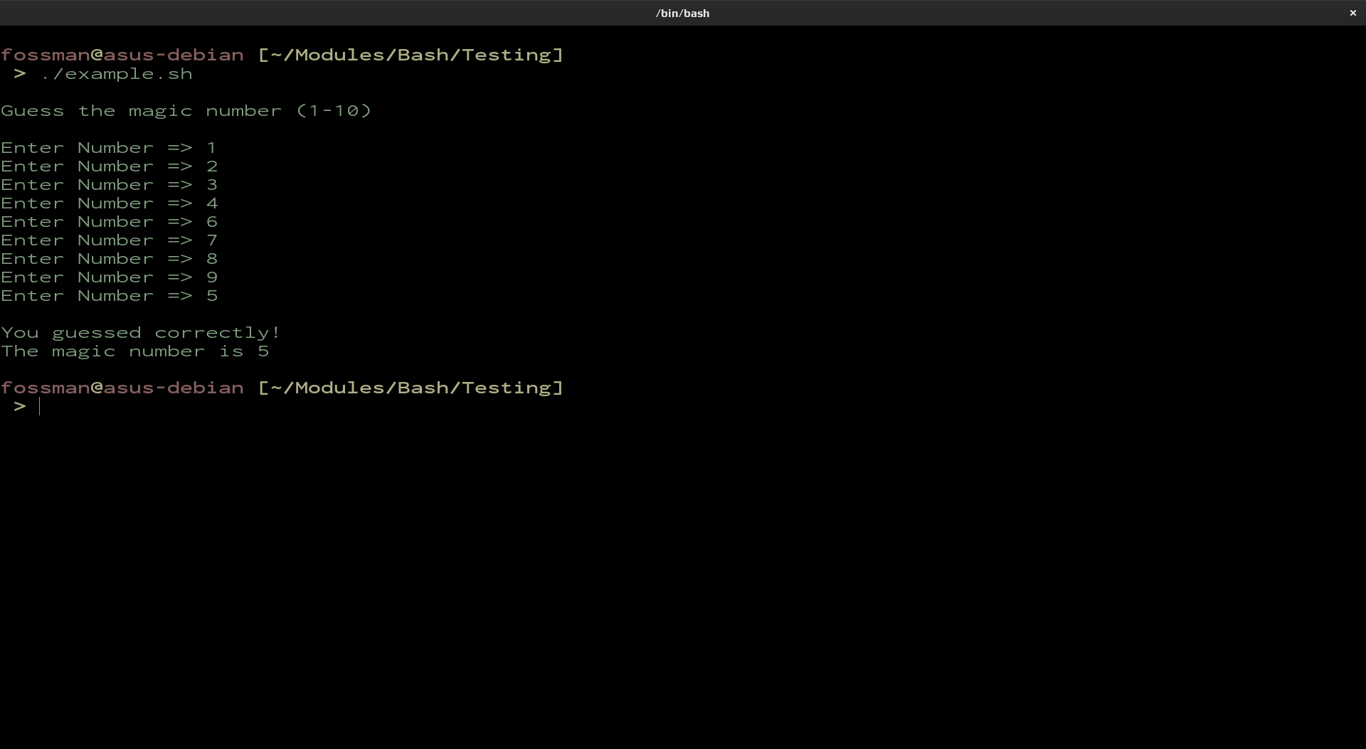 In the example below, the while loop will execute its commands while the value of "guess" is not equal to 5 (the magic number) At each iteration, the user will be prompted to enter a number. When the magic number has been guessed correctly the number will be shown along with some positive feedback. After which, the program will exit.